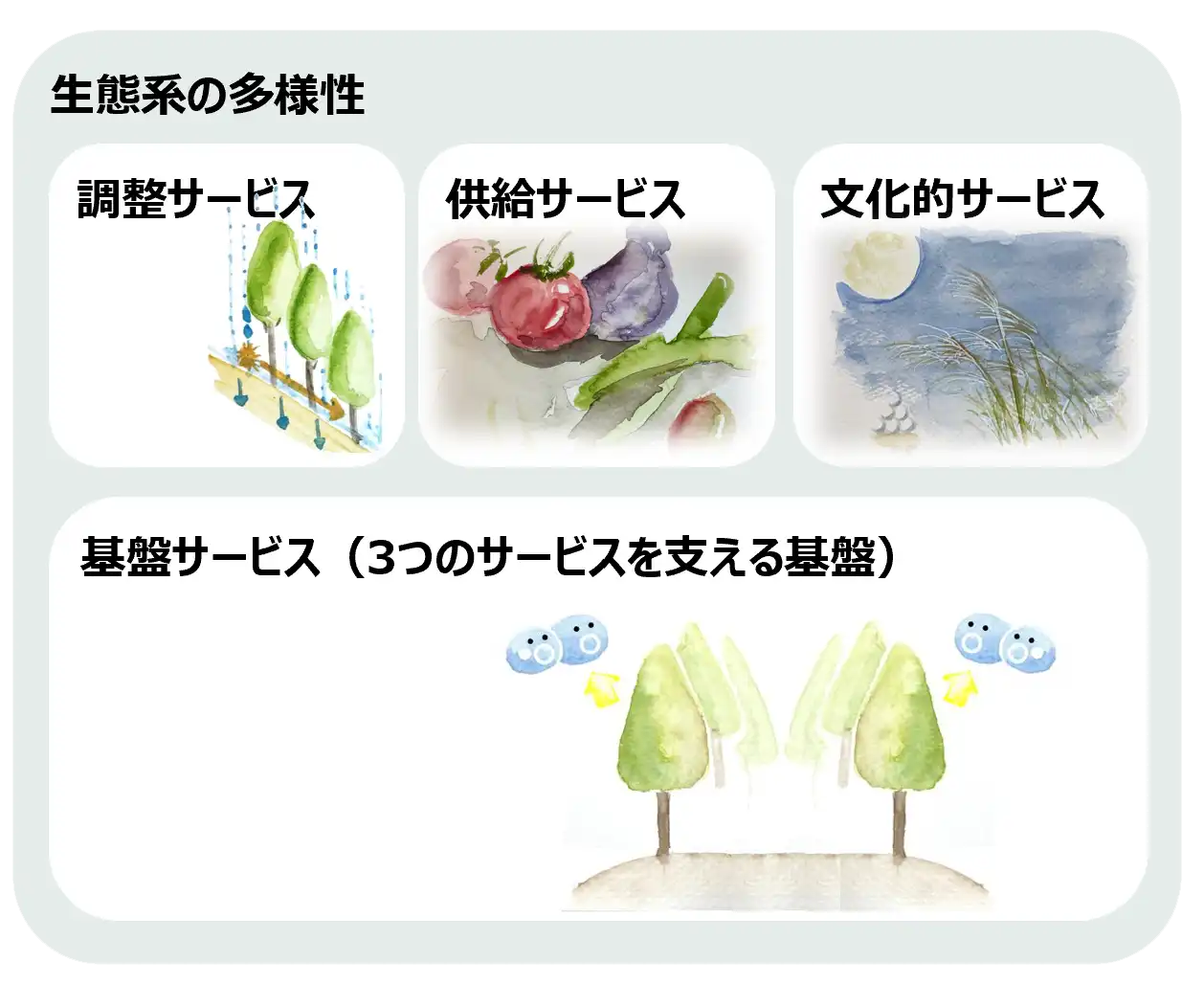たてきくんとおばあちゃんのお話も回を重ねること4回となり、いろんな言葉が出てきました。そこで、これまでのお話のポイントを少し抜き出して、おばあちゃんの言っている「自然の恵み」について改めて振りかえりましょう。 「自然の恵み」は生物が多様だからこそ私たちが受けられる恵みのことで、人間目線の考え方ではありますが「生態系サービス」と呼ばれています。実は、この生態系サービスの恩恵をあえてお金に換算すると日本国内の価値だけでも年間70兆円にのぼり、そして計算できないものも加えるとそれをはるかに超える金額となるとてつもない恵みなのです。 ではここからは、これまで出てきたお話と照らし合わせながらそれぞれのサービスを改めて振り返ってみましょう。 ■「供給サービス」: これなあに? おくすり? シップみたいなにおいするけど... これか?これは昨日家で取れたミントでおばあちゃんがつくった虫よけ。夏は虫が多いからな。さあ、行こか。 関連記事はこちら→ 私たちの生活の様々な場所で食べ物や生活に欠かせない材料などが主に植物から作られます。また、マジックテープや新幹線の先端の形状のように植物や動物の生態から得られるヒントもバイオミミクリー(生物模倣)と言って、供給サービスの一つです。 ■「調整サービス」 もちろんや。もし土がカチカチで水がしみこまへんのに大雨が降ったらどうなると思う?すぐに洪水になったりするで。それに山にしみ込んだ水はゆっくりと土の中を通って地下できれいな水になって川に流れ出たりするんや。 すごいね。じゃあ、山はぼくたちの守り神だね。 関連記事はこちら→ 山の土壌が水を十分吸収でき、ゆっくりとろ過できる状況であれば、洪水や土砂災害などの抑制に大きく寄与します。この機能は私たちの生活を安全で快適なものにしてくれる非常に重要なものです。また、植物は光合成により空気中の二酸化炭素を吸収し体内に炭素をため込むため、木材などではその重量の約半分が炭素でできているのです。つまり、山で伐った木を使った建物は、空気中の二酸化炭素の中の炭素をため込み、伐った後に木を植えるとまた、新たに二酸化炭素を吸収するという自然と人間の良好な関係性が生み出す循環が、持続可能な調整サービスを支えることになるのです。日本は国土の約2/3が山です。まさに、たてきくんが言うように「山は私たちの守り神」といえるでしょう。 ■「文化的サービス」 お世話になってるものって何だろう?おばあちゃんがいつも言ってる自然の恵みと一緒かなあ? たてきくん、こっちにたくさんどんぐりあるで。一緒に拾おうや。まんまるのや細長いのやいろんなんがいっぱいあるで! 関連記事はこちら→ 日本は南北に長く四季折々、それぞれの地域に根付いた自然の表情を楽しめる国です。そのため、私たちの生活には古来より深くその自然がかかわってきたことは言うまでもありません。自然は食や遊び、お祭りなどの行事を華やかに、時に厳しく時に彩りを加えます。ここで出てきたドングリなどは秋の子供たちの楽しみの定番ですね。子供のころから自然の癒しや学びに触れることは、これからまずます重要となるネイチャーポジティブに向けた自然との共存を考える基盤となっていくでしょう。 ■「基盤サービス」 酸素は植物がはきだすんやけど、月にはその植物がないから酸素はできひんのや。 そっかー、植物ってなんかすごいんだね。 関連記事はこちら→ これまでご説明した生態系サービスを生み出すために欠かせない酸素や生物たちのつながりや関係性を支えるサービスを基盤サービスとよんでいます。 ■まとめ 生態系サービスは、「基盤サービス」を根幹に「供給サービス」「調整サービス」「文化的サービス」の4つで構成されていることをご理解いただけたでしょうか?「自然の恵み」である「生態系サービス」を持続可能にすることで私たちの生活は支えられます。この環境を次の世代が安心して暮らせるより良い形で残していくために、わたしたちにできることがいろいろとありそうです。